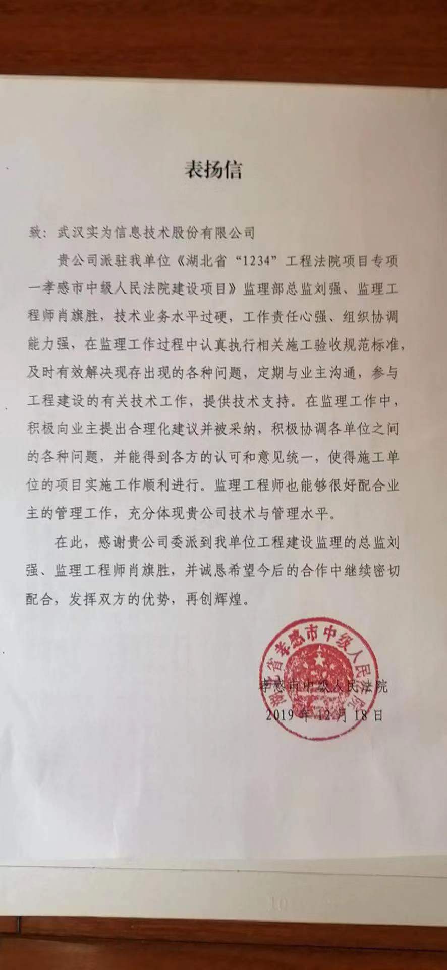 實為公司獲得湖北省孝感市中級人民法院表揚